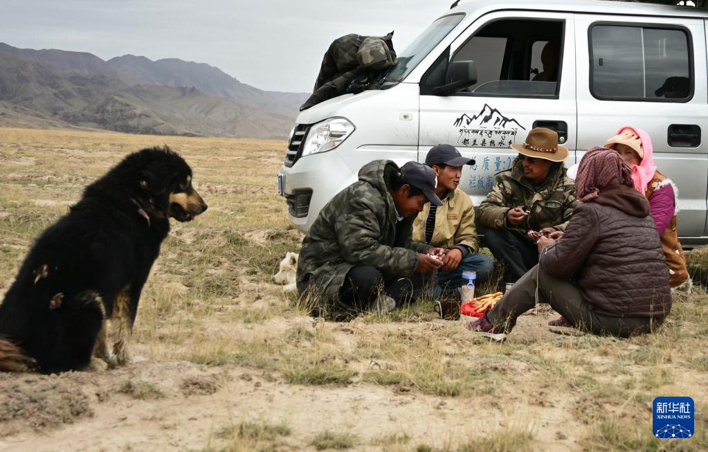 9月9日,在青海省海西蒙古族藏族自治州都兰县,牧民龙宫一家人在转场休息时吃午饭。新华社记者 齐芷玥 摄