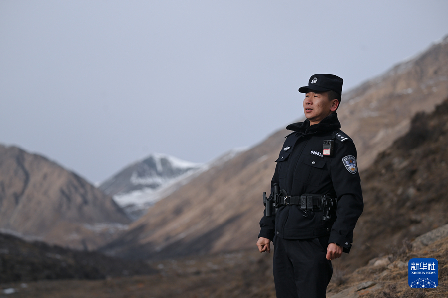 1月9日,在青海省海北藏族自治州门源回族自治县境内的老虎沟,民警郭建业用望远镜查看远处。新华社记者 张龙 摄