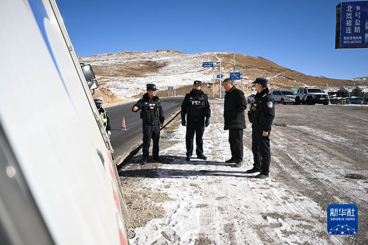 1月9日,在青海省海北藏族自治州祁连县,峨堡派出所的民辅警驾车巡查路况。新华社记者 张龙 摄